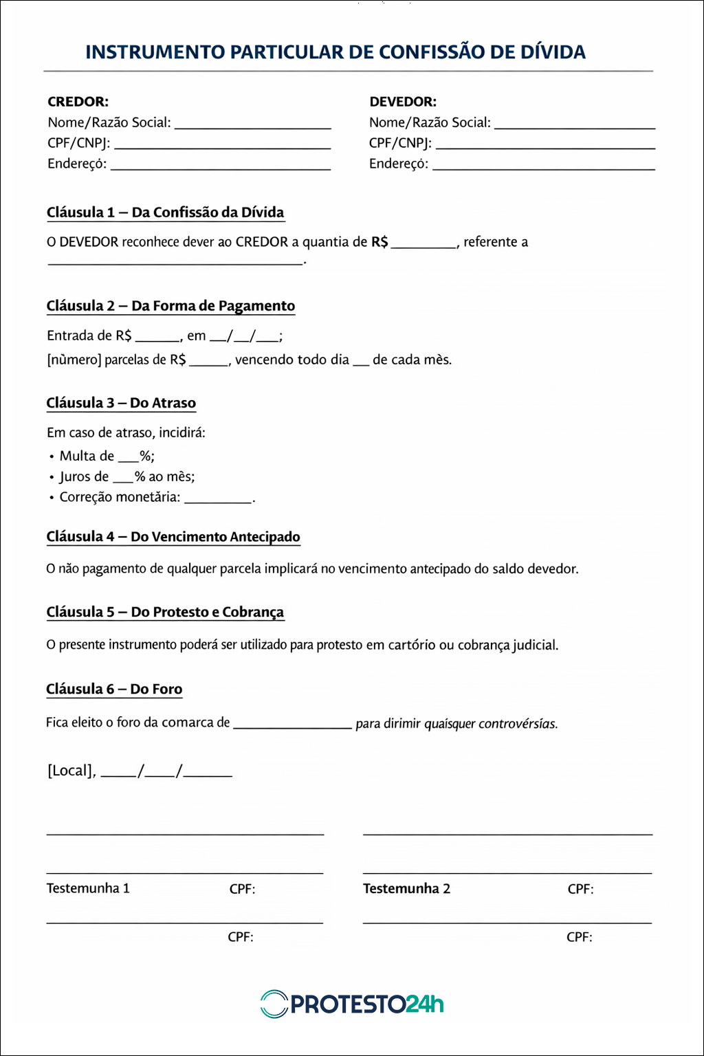 Por fim, o termo deve ser assinado pelo credor e pelo devedor, conter a data da assinatura e, preferencialmente, incluir também a assinatura de testemunhas para reforçar sua validade jurídica.